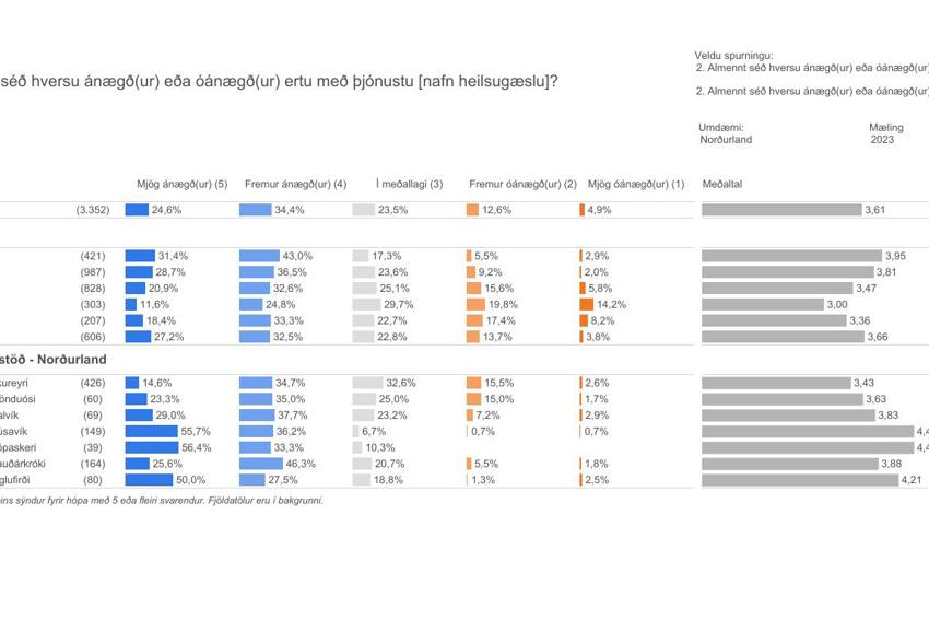 Sé horft á Heilsugæsluna á Akureyri eru einungis 49,3% fremur eða mjög ánægðir árið 2023, þeir voru 62,5% árið 2020. Þeim sem mælast fremur eða mjög óánægðir á sömu heilsugæslustöð fjölgar úr 14,2% árið 2020 í 18,1% að sama skapi 2023. Heilsugæslan raðar sér á tímabilinu 2020 í 27 sæti af 33 mögulegum á landsbyggðinni, 21. sæti árið 2022 og í 25. sæti árið 2023.